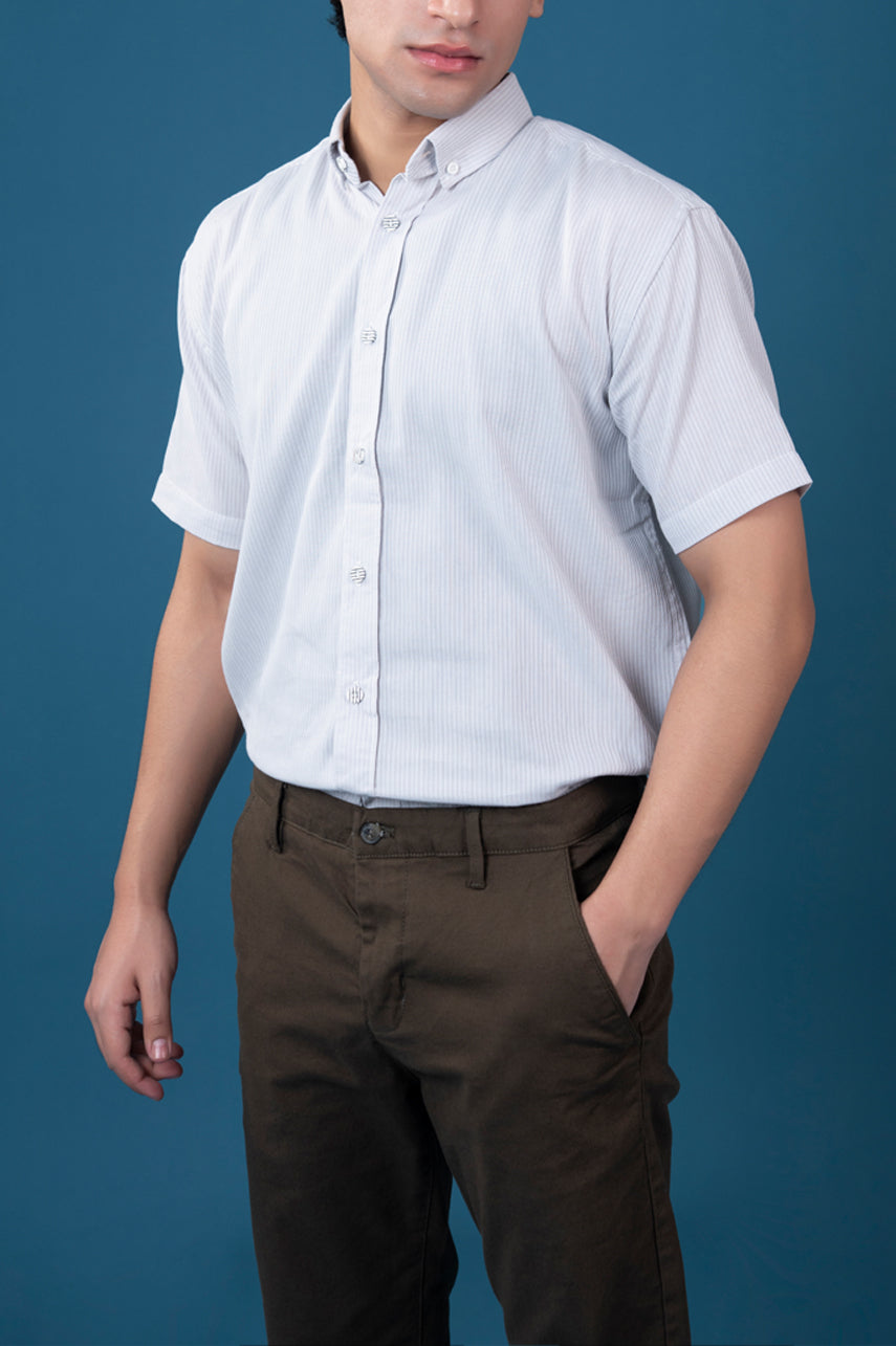 Design: Short-sleeve striped shirt with button-down collar and full front placket