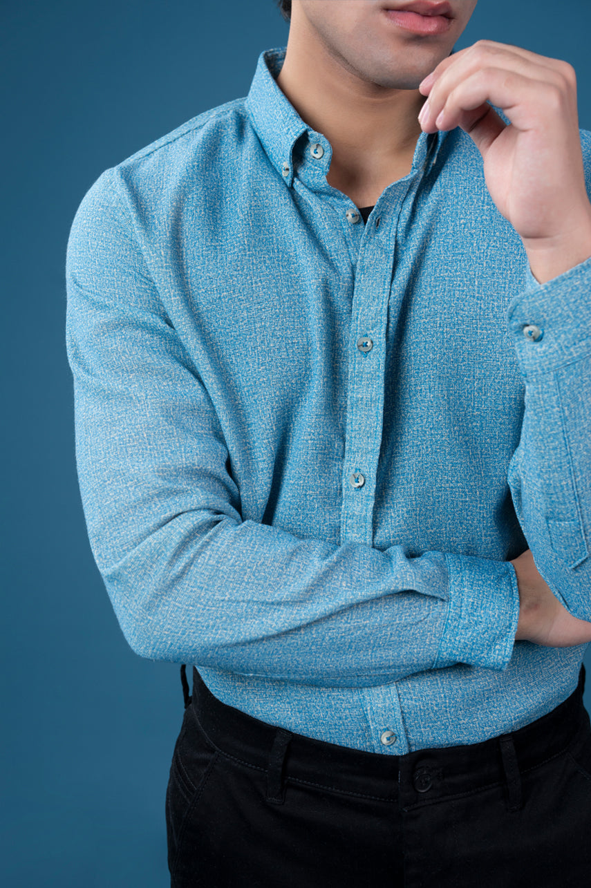 Design: Solid textured shirt with a button-down collar, full sleeves, and a clean front placket for a refined everyday look