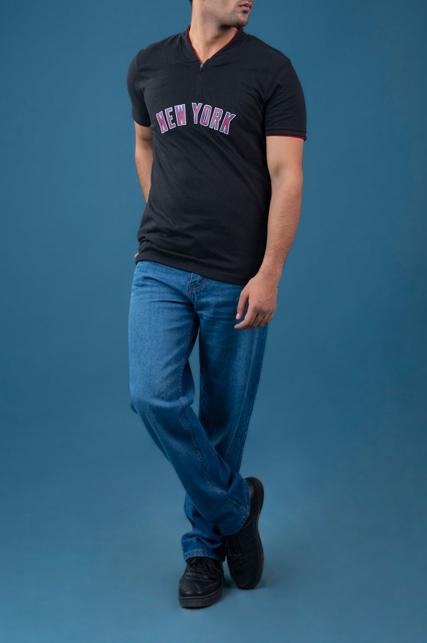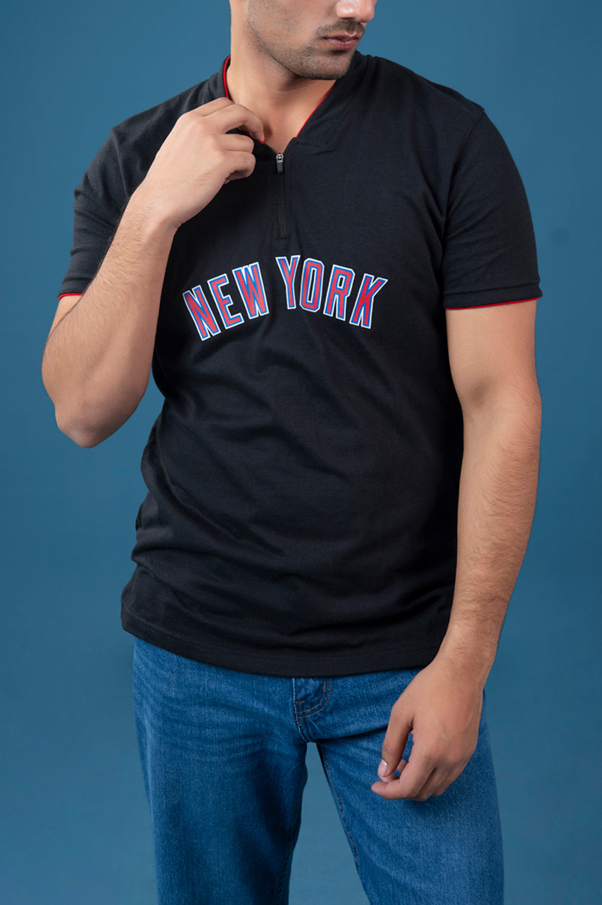 Design: Black short-sleeve t-shirt featuring “NEW YORK” varsity embroidery on the chest, a half-zip neckline, and contrast red sleeve tipping for a sporty urban edge