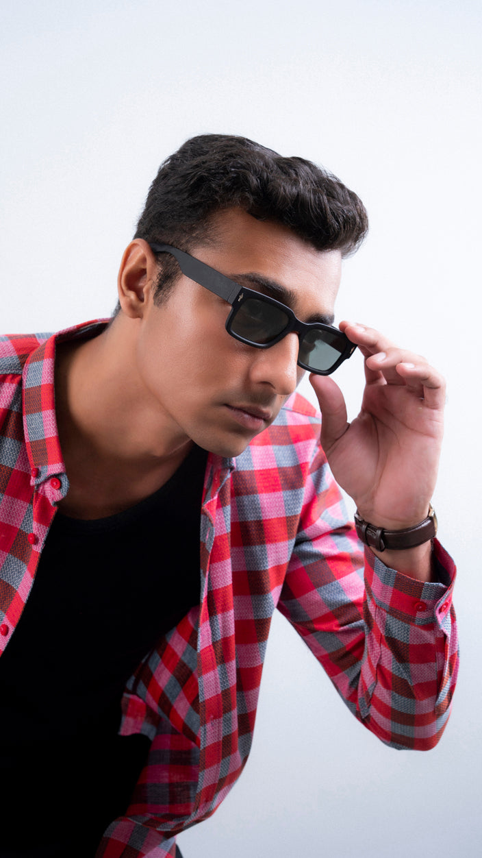 Design: Red and grey checked casual shirt with button-down collar and full sleeves.